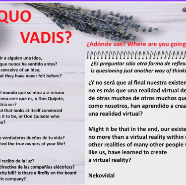 . . . pero no se preocupe, intente buscar ese equilibrio que le impida convertirse en un ser enquistado en un par de ideas cómodas o un ser que desperdicia su vida en luchas estériles; riegue el campo de las ideas, el único camino a la libertad y al disfrute de la vida pasa por el conocimiento, en cualquiera de sus formas; viva y deje vivir, pero no olvide la impresionante grandeza y riqueza del universo que habita, no olvide que ya sabemos que nuestro cerebro no está diseñado para captar objetivamente la realidad, sino sólo la parte de ésta que nos ayude a sobrevivir; no olvide que, con lo que hasta hoy sabemos, podemos afirmar que todas nuestras verdades no son más que verdades imposibles, construidas con ese material del que, como recordamos ocasionalmente, están hechos los sueños . . .